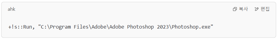 이 코드를 AutoHotkey 스크립트로 저장한 후 실행하면 해당 단축키를 눌렀을 때 원하는 사진 편집 프로그램이 실행됩니다.